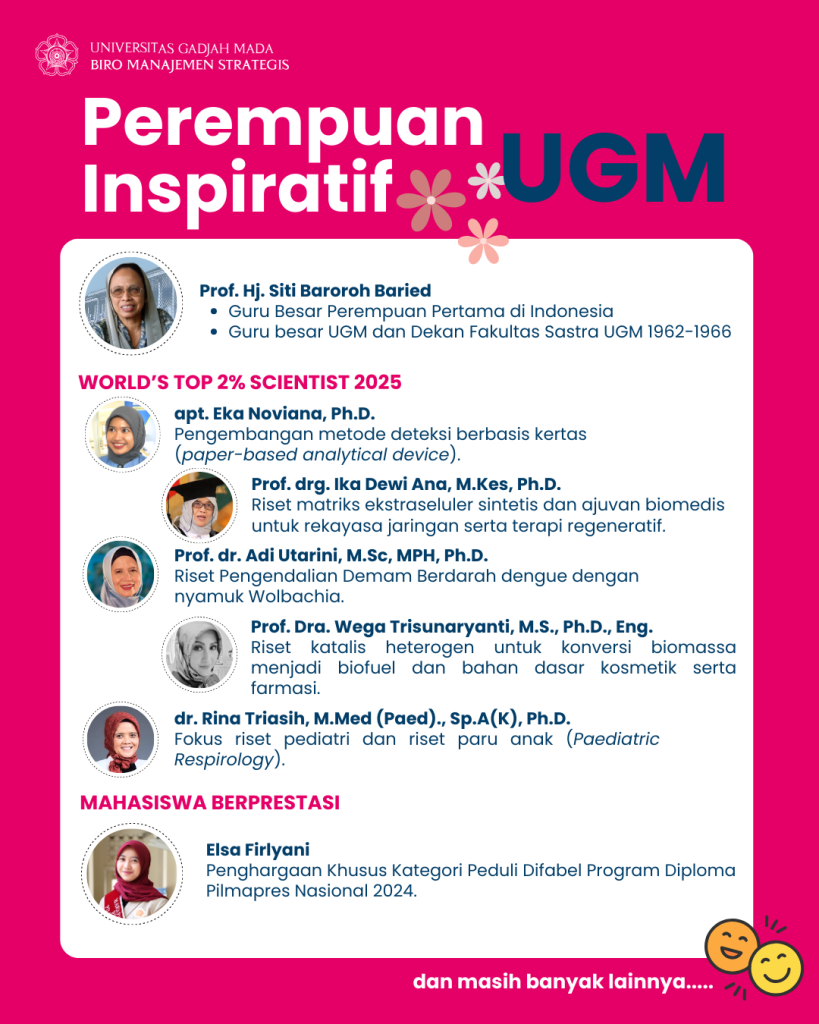 Komitmen dan ekosistem kampus yang aman ini telah melahirkan banyak tokoh inspiratif dari masa ke masa. Sejarah mencatat nama Prof. Hj. Siti Baroroh Baried sebagai Guru Besar Perempuan Pertama di Indonesia. Di era modern, dedikasi tersebut diteruskan oleh jajaran srikandi UGM yang masuk dalam daftar World’s Top 2% Scientist seperti apt. Eka Noviana, Ph.D., Prof. drg. Ika Dewi Ana, Prof. dr. Adi Utarini, Prof. Dra. Wega Trisunaryanti, dan dr. Rina Triasih, serta mahasiswa berprestasi nasional seperti Elsa Firlyani. Kiprah luar biasa mereka menjadi bukti nyata bahwa ketika perempuan aman dan berdaya, pendidikan menjadi jauh lebih bermakna. Selamat Hari Perempuan Sedunia!